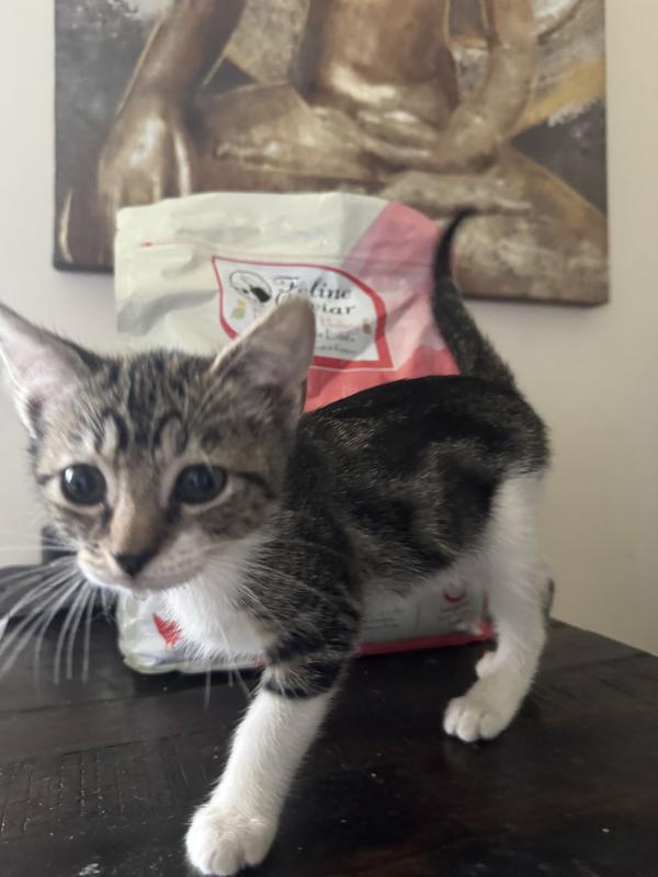 I do not know if words will properly convey the excitement and the extreme devotion Spicey already exhibits towards Feline Caviar. When we first received the bag,
