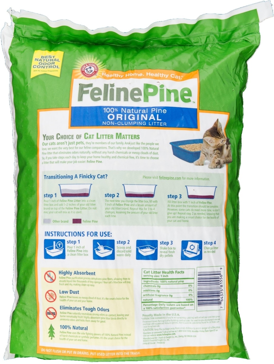 Feline Pine Platinum non-clumping cat litter is made with Arm & Hammer baking soda. The natural odor-neutralizing power of baking soda provides an extra boost of absorbent, odor-fighting freshness in your cat’s litter box.