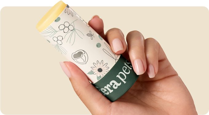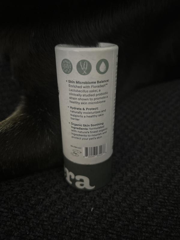 No twist-up plastic here. Our sustainable tube pushes up from the bottom. After use, gently tap the bottom to retract the balm. Safe if licked and easy to apply to dry/irritated noses, paws, elbows, or skin for gentle relief and nourishment.