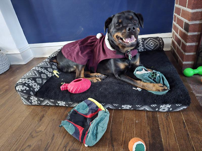 While the antenna was chewed off pretty quickly, it has been a good challenge for our pup to get the tennis ball out. Unfortunately, she cracked the ball in ha
