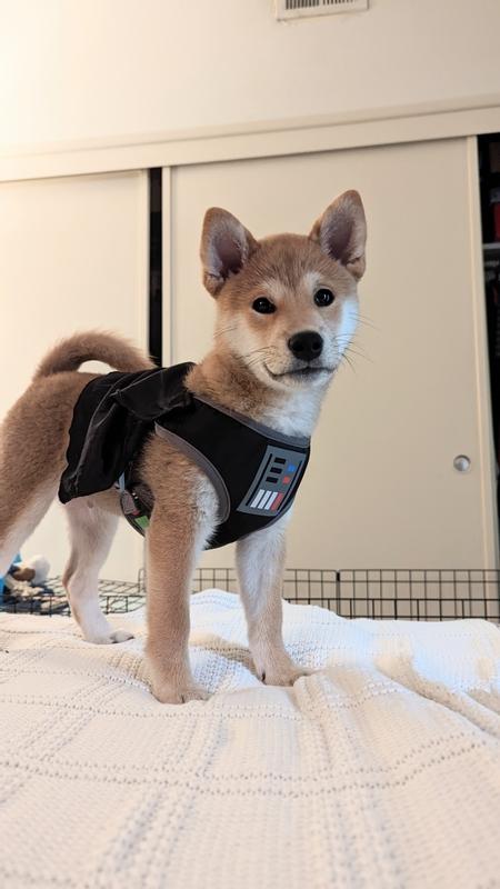Big star wars fan so we bought our sweet angel boy this harness. He’s 25 pounds and medium is perfect!