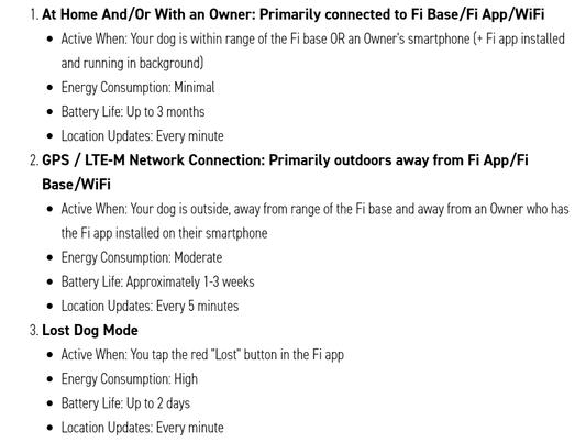 Fi Series 2 Collar has 4 operating modes. How long your dog's Fi collar battery lasts depends on which operating mode is most active. Please refer to the photo below for more in-depth details:
