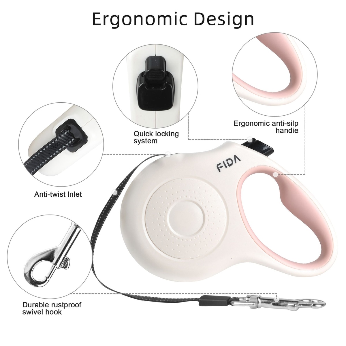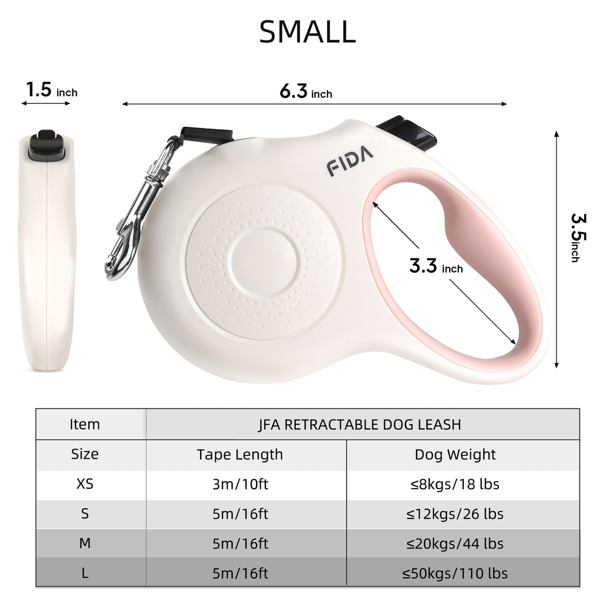 FIDA JFA Retractable Dog Leash, White, Small: 16-ft long