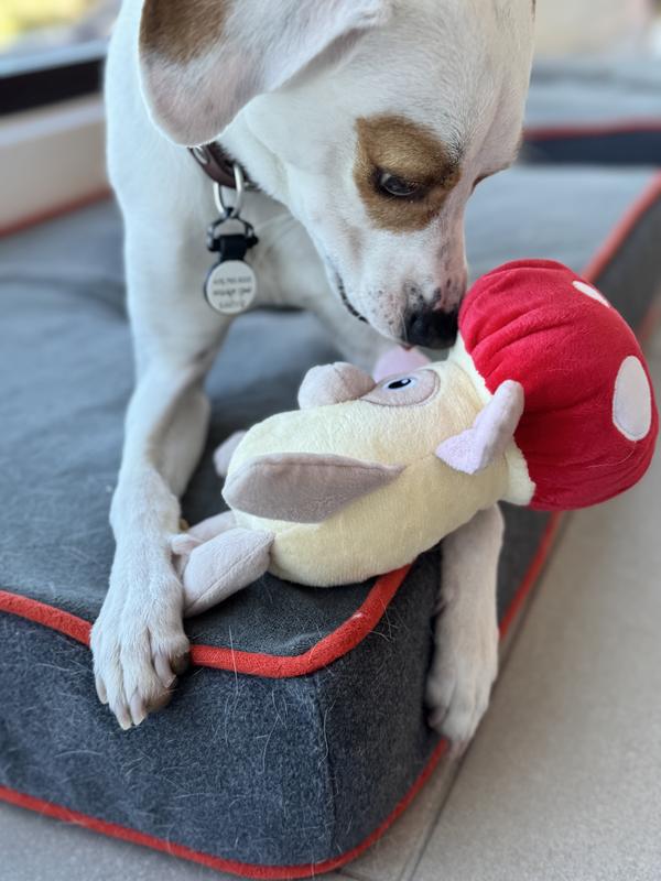 Fikas Freaky Friends Mushroom Bunny Squeaky Emotional Support Plush Dog Toy, Red/Grey/White