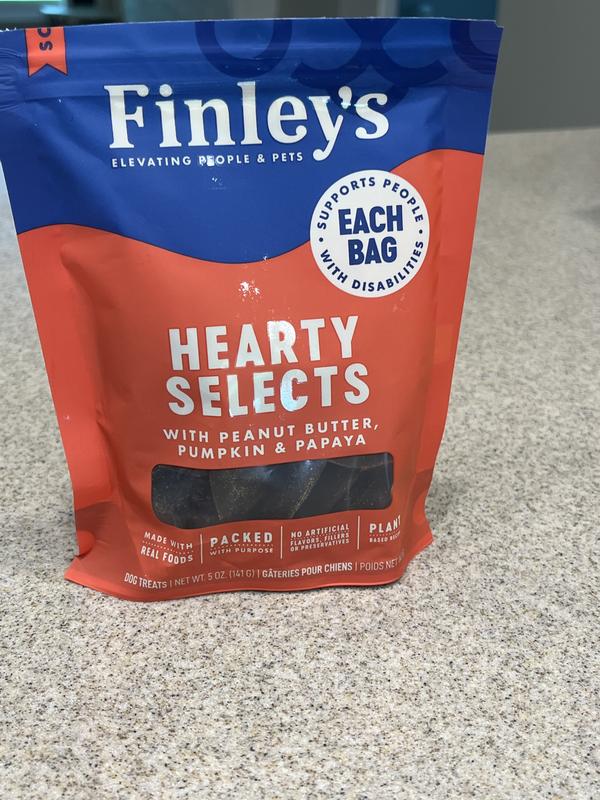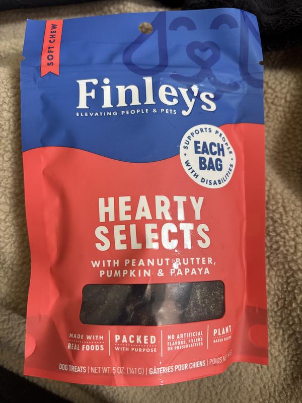 We’ve been trying to find the perfect balance between healthy ingredients and something our lab mix actually gets excited about — and Finley’s Hearty Selects with peanut butter, pumpkin, and papaya are definitely a win! The texture is soft enough for easy chewing, but still firm enough to make it feel like a real treat. The smell is fresh (not overly artificial or strong), and our dog comes running every time we open the bag. The peanut butter and pumpkin combo is a classic, but the papaya is a nice bonus we haven’t seen in many other treats — and it seems to agree with his stomach, too. We especially love that these are made with simple ingredients and support a mission we can feel good about. Great size for a reward or a light snack — not too crumbly, not too big. Highly recommend for medium to large dogs who love soft treats with wholesome ingredients!