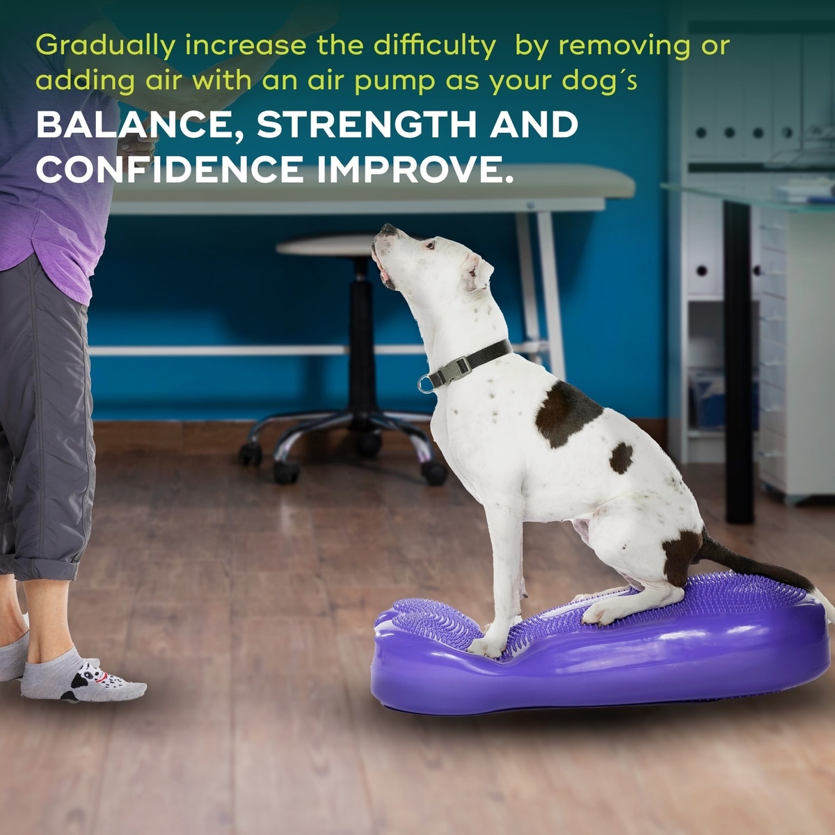 At different levels of inflation, this item is just too wobbly for our sensitive dog. We're working with a K9 rehab specialist and they recommended the FitBone, but when he steps on it, the item moves too much and his feet slide off. We're trying a different item now (Propel Air Platform) and they're much more stable for him, allowing us to do the exercises as intended. They're more expensive, and I had to buy two sets because our dog is large, but worth not seeing him freak out at having from footing fly off the equipment.