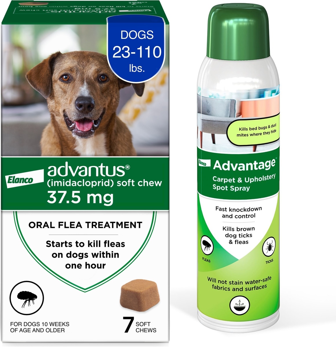 This Flea Prevention Kit includes 2 products: Advantus Flea Oral Treatment for Dogs, 23-110 lbs, 7 Soft Chews and Advantage Carpet & Upholstery Spot Spray, 16-fl oz spray.