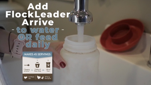Add one teaspoon of FlockLeader Arrive per gallon of water. Supplement FlockLeader Arrive daily in the water until chicks are six to eight weeks. Then switch to FlockLader Thrive as a daily water supplement for your flock. Discard any unused solution after 24 hours. This product can be used on all poultry species.
