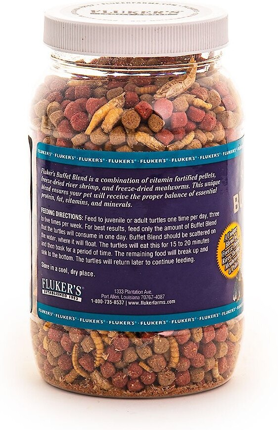 Feed to juvenile or Adult turtles 1 time per day, 3 - 5 times per week. For best results, feed only the amount of Buffet Blend that the turtles will consume in 1 day. Buffet Blend should be scattered on the water, where it will float. The turtles will eat this for 15 - 20 minutes and then bask for a period of time. The remaining food will break up and sink to the bottom. The turtles will return later to continue feeding.