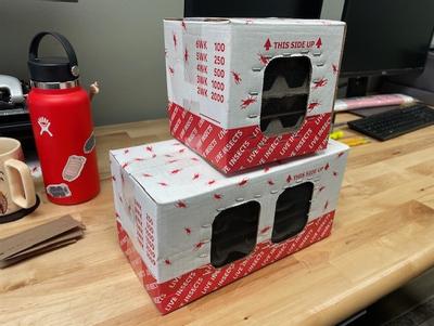 Depending on the size and quantity of roaches ordered, they may come in an 8-oz deli cup, a 16-oz deli cup, or a variety of box sizes. The only quantities that come in deli cups are Small 50ct, Small 100ct, Medium 50ct, and Medium 100ct. Anything more than 100 Small or Medium will come in a box. All counts of Large dubia roaches come in boxes. The boxes will likely be one of the two shown in the included picture. The top box is approximately 6.25" x 6.25" x 6.25" and the bottom box is approximately 12" x 6" x 6". If customers prefer to have the dubias contained in deli cups, they need to order the desired amount of either the Small or Medium roaches in a 50 or 100-count and the manufacturer will pack them into the appropriate-sized outer box.