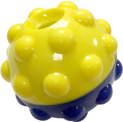 The slow dispensing mechanism consists of a couple rubber bumpers around the inside opening of the hole made of the same thermoplastic rubber as the rest of the ball. It stops the treats from falling out too easily. The difficulty level is not adjustable. The diameter of the hole is approximately 1”. The ball does not come apart for cleaning. To clean your Bumper Treat Ball, you can place it in the dishwasher, as it is dishwasher safe. Be sure to place it on the TOP RACK only, with the hole facing downwards. Make sure the inside of the toy is completely dry before using it again, to prevent bacteria or mold build up. Alternatively, you can also put a drop of dish washing detergent in the hole, fill with water and give it a good shake. Rinse until soap is gone, and lay on a rack with the hole facing down to dry.