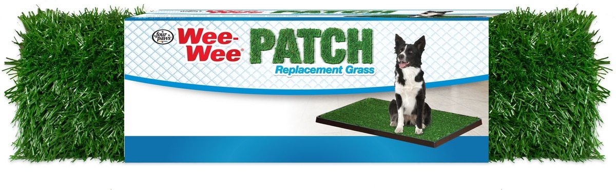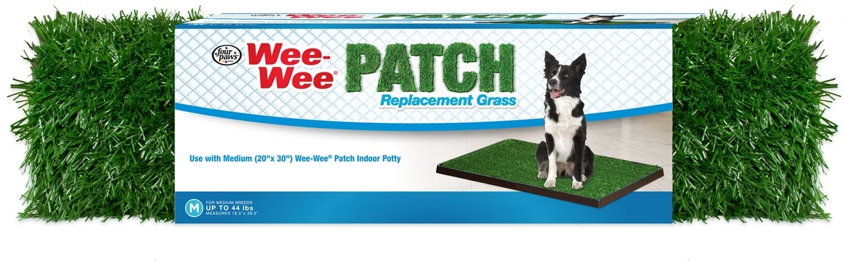 The Wee-Wee Indoor Potty (Medium) measures 30 x 20 inches and the Wee-Wee Patch Replacement Grass Mat (Medium) measures 19 x 29 inches.