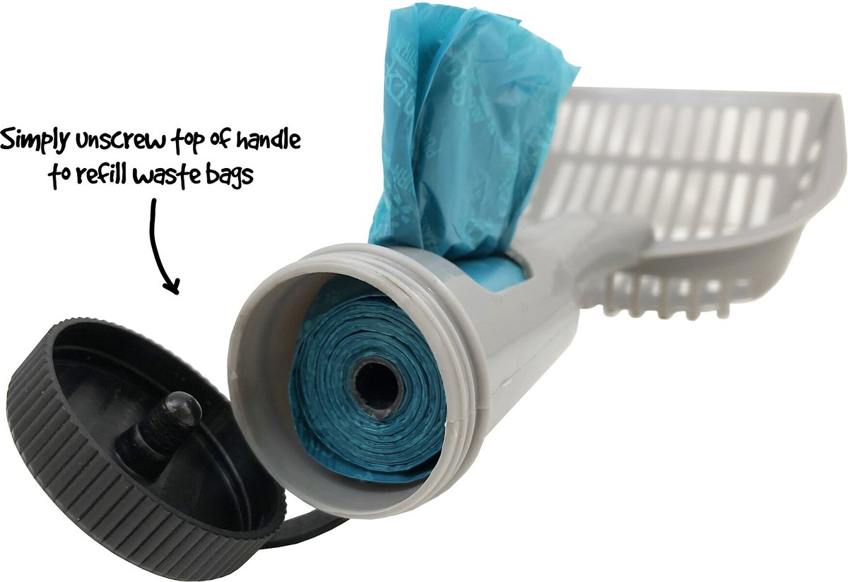 The scoop and bags in handle is a great idea / invention however I found the scoop itself to be very flimsy and too lightweight . I use a heavy duty metal scoop slabs I love ut. I decided to try the plastic scoop due to bags in handle and compact all in one. . I went back to my metal one . If this was a better grade of plastic it would be great but in my opinion it’s very cheaply made. Make it with a heavier plastic scoop and handle and it would be good.
