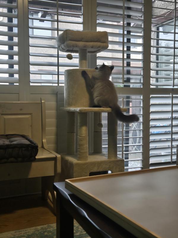 4 month old kitten loved it immediately. It’s nice and tall with a cozy bed at the top. Great for kitten zoomies and naps