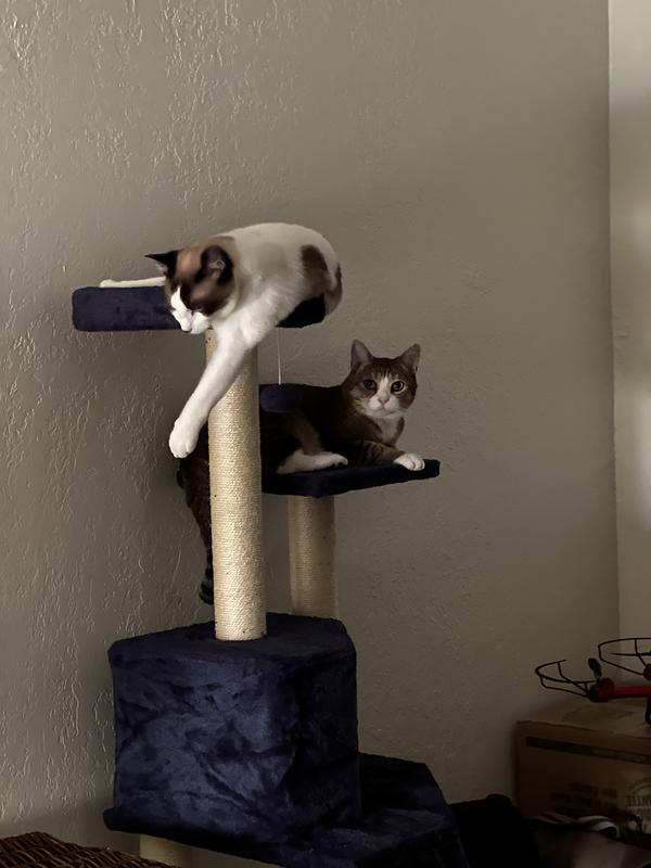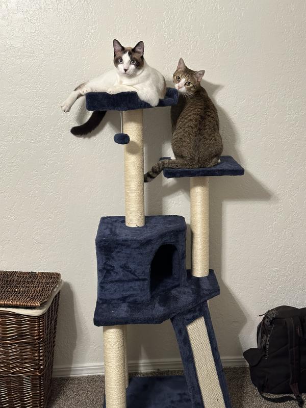 This is actually the second time that I have ordered the 72” cat tree for my 4 cats. The last time, I ordered the grey, and this time decided to go with the dark blue. Let me tell you, the dark blue looks NICE. It is very pleasing to the eye, and I already knew my cats loved the model. I ended up getting the bundle with the 50 (ish)” tree because I wanted one in my bedroom, too. We have three large size cats and one small cat, and all four seem to love the trees. They do not consistently use all of the “huts” as we call them, but they LOVE the beds at the top of the tree, and seem to have tons of fun playing in and around it. Both cat trees are very stable and relatively easy to assemble. Having a ratcheting driver does help a ton, and I highly recommend using one over their provided Allen wrench. Other than that, the product is a great buy, and my last one hung around for just shy of 4 years. We did rewrap the sisal, though.