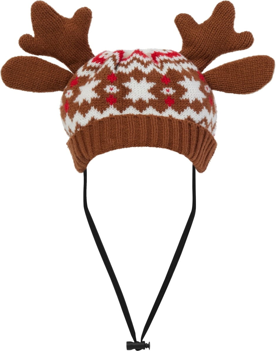 - This brown, knit hat features a Fair Isle pattern and antler accents at the top to make your aspiring reindeer feel more authentic.