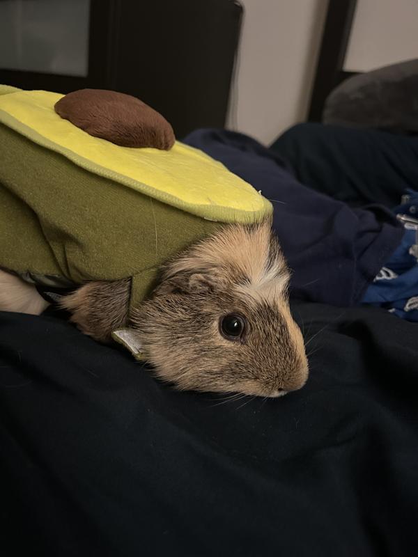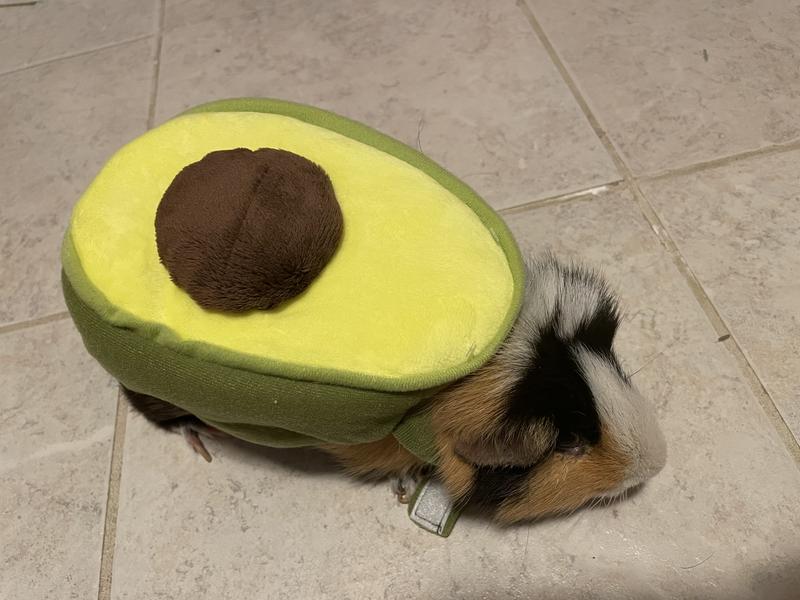 This outfit is hilarious looking! It's also funny since my guinea pig's name is Toast....Avocado Toast. The costume was a little big on him but he tolerated it long enough for him to run around in for a little bit and entertain me.
