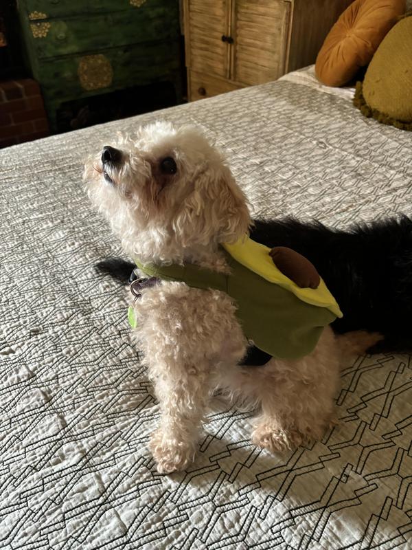 Adorable costume for my piggie! I’m entering my pig in a costume contest, and this avocado is absolutely perfect! It’s a very soft material, the belly/chin strap are adjustable which is great. I’m having my younger/smaller pig wear the avocado, but I was pleased to see it was adjustable enough to accommodate my XL adult pig if I had wanted :) My little guy didn’t seem to mind wearing it all (of course it’s only worn for a short amount of time). I will definitely be buying other Frisco pig costumes lol!
