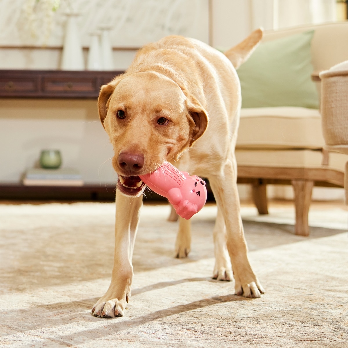Chew toys feature a variety of beneficial designs including a proprietary, non-toxic, BPA-free, real wood-blended nylon that’s gentle on teeth, as well as ergonomic shapes with highly textured surfaces to help to clean your dog’s teeth as they chew.