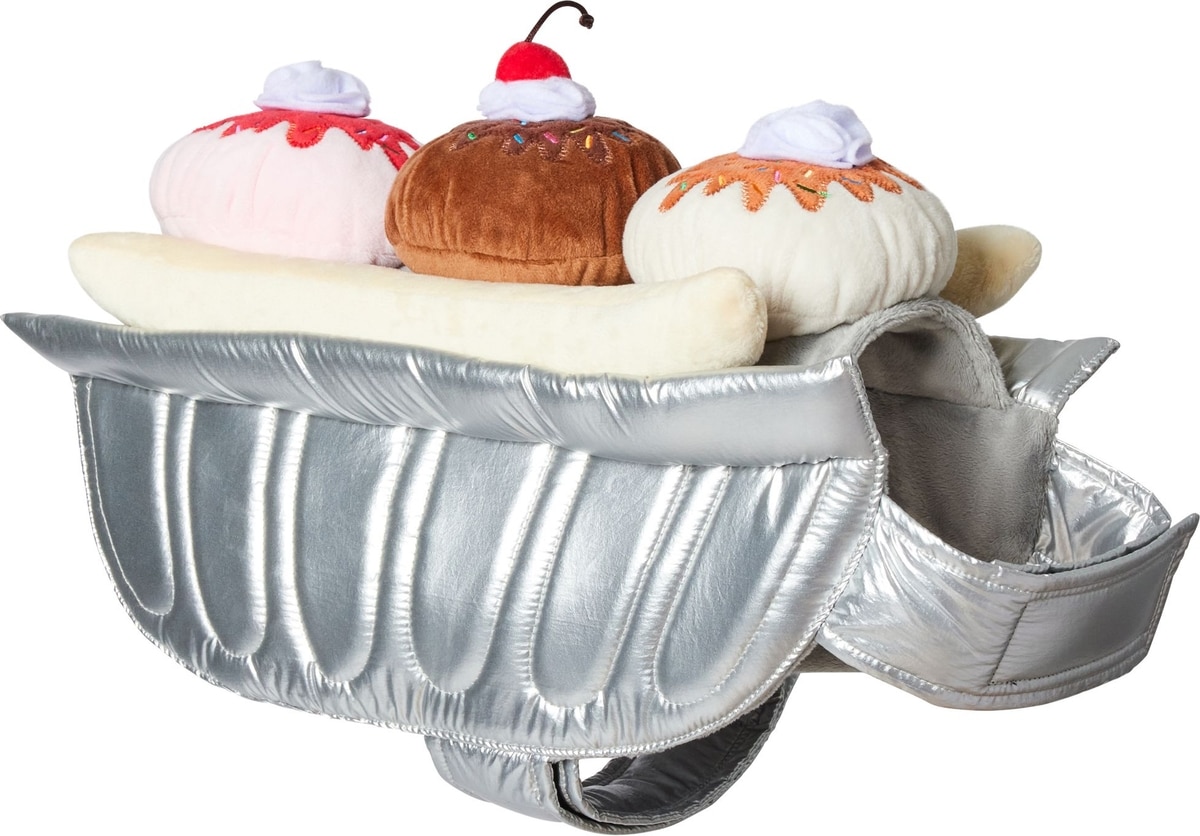 • Your pet brings a classic American dessert to life with this banana split costume.