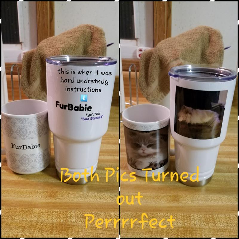 It's just anothr tumbler, nicely made, double layer and a 5 star if the instructions how to place what u want it to say example- FurBabie's name, #1 Cat, birthday etc ur choice of what u want it to say. Howvr mine wsn't wher I wanted my words, the photo is perfect. Furbabie \\\=^..^=/// Soo Blessed That is what I wanted it to say, just not placed wher it is. The Tumbler itself is made very nicely, and it'sa lg sz tumbler. All I can say is mayb thers a website to "walk thru" how to get what u want on it an wher. Mayb I could've ask chewy or started with chewy n how to do it all.