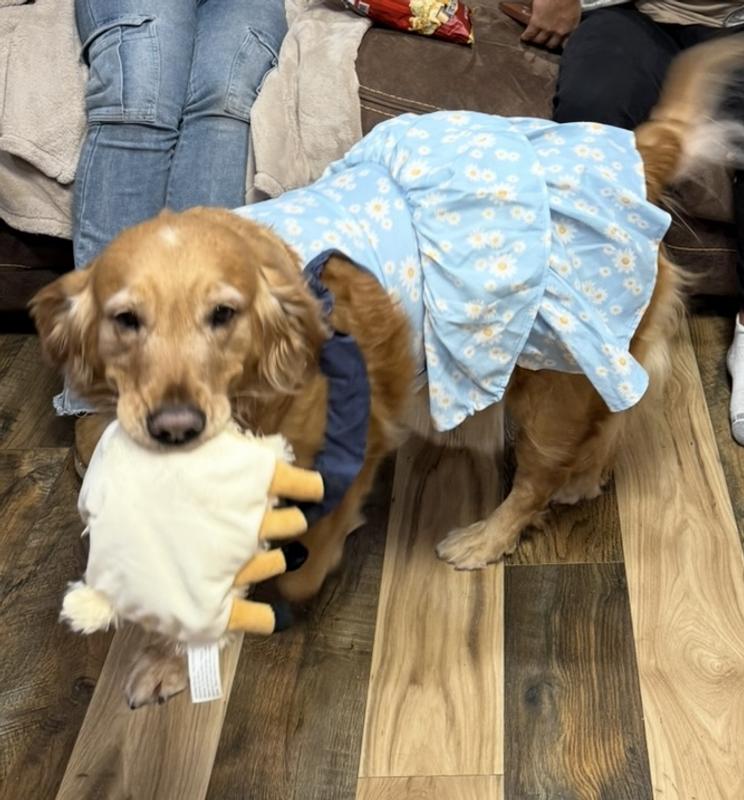 Frisco dresses are great and we love buying these when they’re on sale! One of our dogs is very prissy and loves to wear clothes. The Frisco dresses fit more often than others. We actually got this dress for her years ago (as well as another, which I’ll copy review for) when she was still growing, but we got a large and it was just a bit too tight in the chest so we had to return both, but hoped the XL size in each of them would come back in stock. So happy they finally did! She looks adorable in this and shipping was very fast. For reference, our girl is a medium sized schnoodle mix we think, (she was a rescue so not sure) and she’s about the size of my tall beagle, or slightly larger maybe than a cocker spaniel. So she’s not exactly what I’d think of for size XL, but she also has a very deep, boney, standard poodle-like chest so large doesn’t usually work out for her for that reason alone. That said, if you have a golden retriever, large lab or anything larger, I’d maybe try size over XL, unless they’re smaller for the breed. And Thanks to Chewy! We appreciate y’all!
