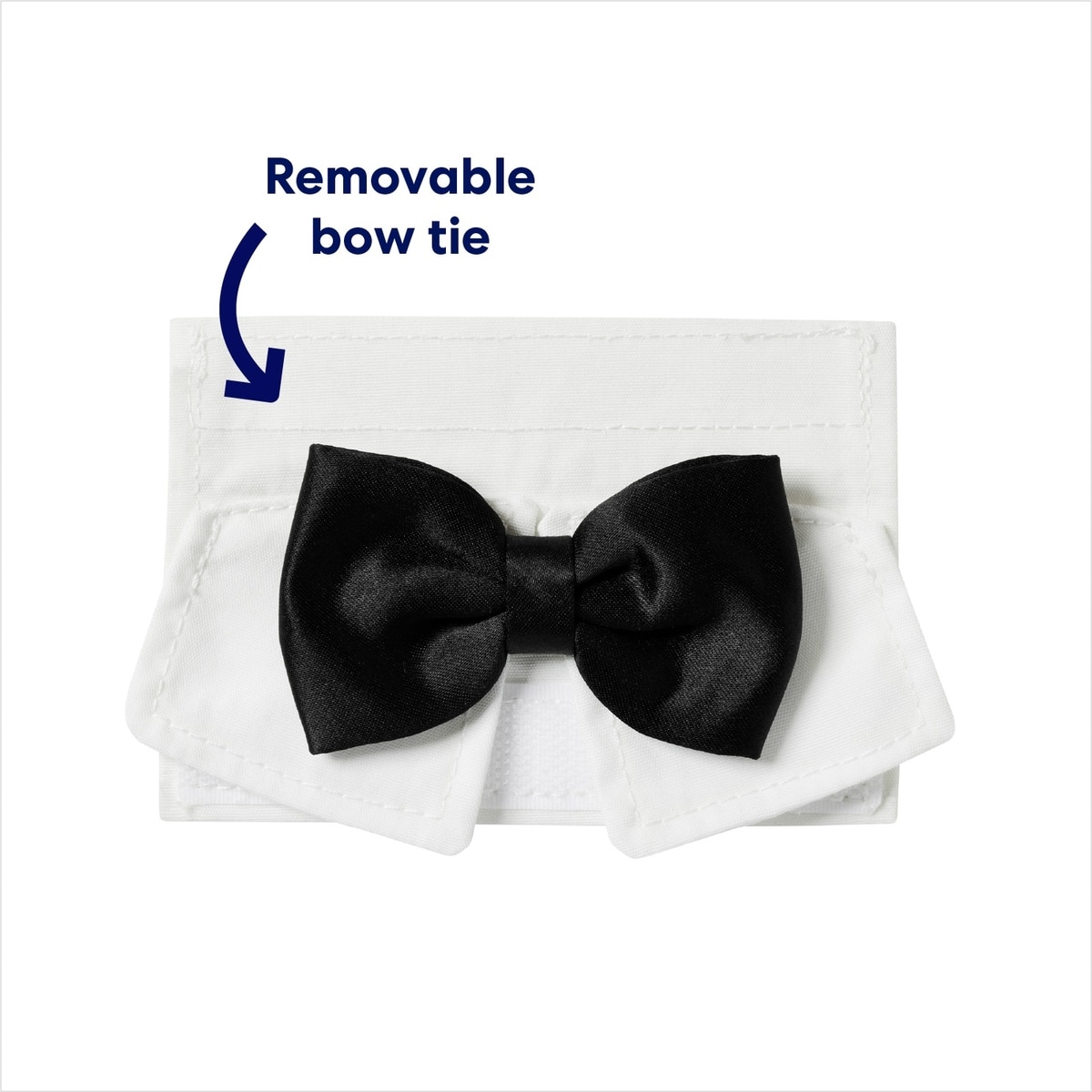 Frisco scores a front row seat the wedding with this adorable formal bowtie. The crisp satin black and white bowtie is removable and attaches to a beautiful white