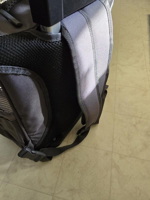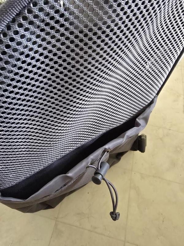Pros: *Perfect size *Great airflow *Rolls smoothly *The pockets - drawstring pocket can easily and securely hold 2 stainless steel water bottles and the other pocket with flap closure holds several smaller items securely *Cover for the back wheels Cons: -have to add a separate cushion as the mat included is very thin - there should be a brake system for the wheels as it will keep rolling on even the slightest bit of uneven ground -- unsafe! - the wheels get caught on thresholds or elevator entrances -- carrier can tip over - the teather is not adjustable plus is attached at the top of the carrier instead of the bottom so pet could actually jump out Overall I am quite happy with this carrier and it serves our needs well however, a few improvements are needed.