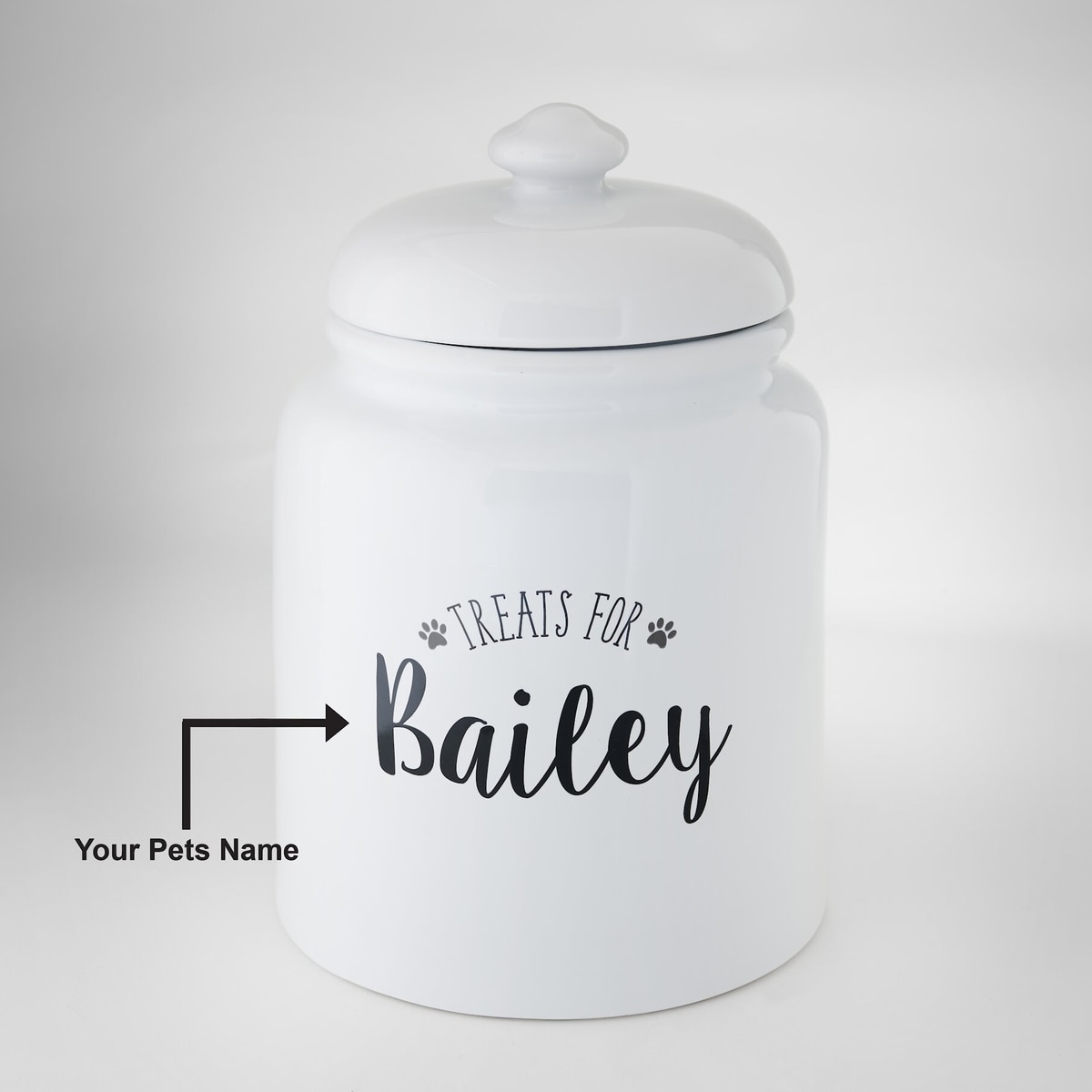 This treat jar features a custom “Treats for” graphic on the side with space for up to 12 characters of text maximum can be added per line.