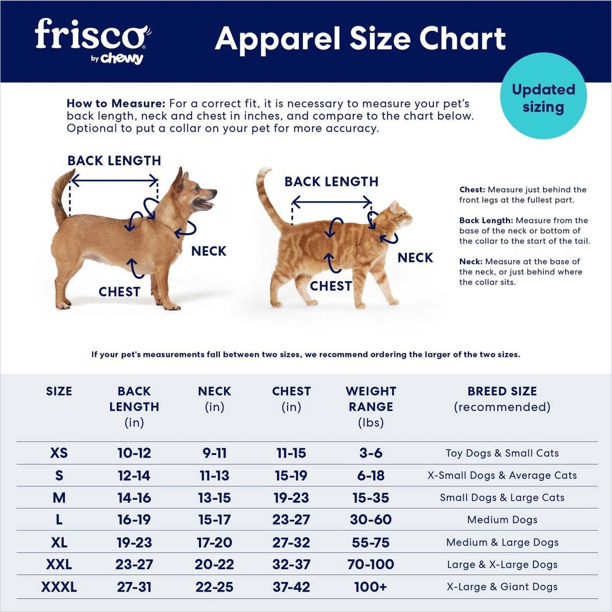 For the best fit, match the size dimensions to your pet's measurements as closely as possible. The chest measurement is the best way to determine the correct size. Also consider your pet’s back length for items like pajamas or playsuits. If your pet falls somewhere between two sizes, we advise ordering the larger of the two.