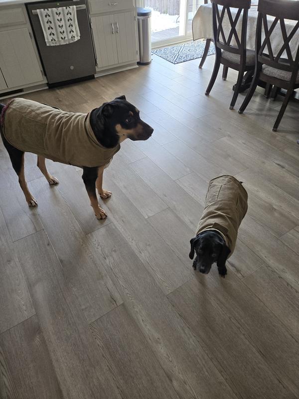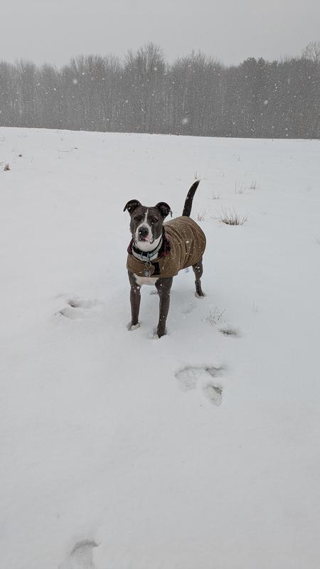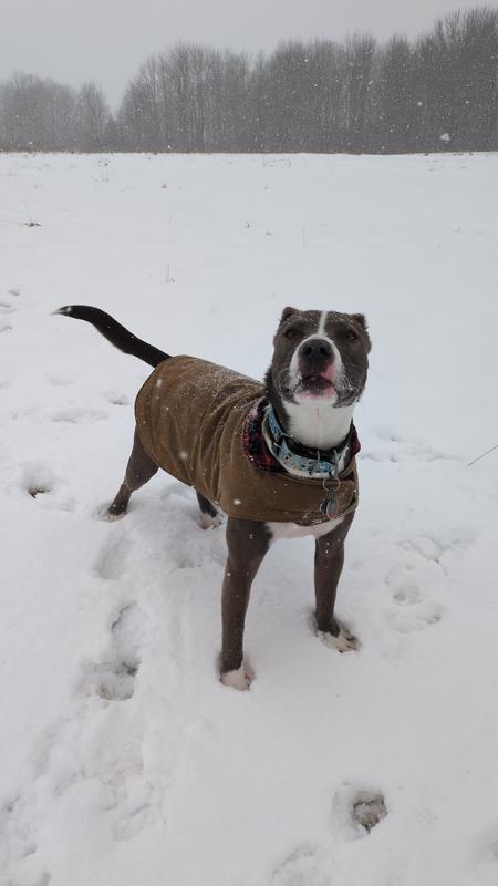 Love the classic look of the waxed canvas. It is well made & fits Piper beautifully. Everyone we meet comments on the look of her coat. I appreciate the velcro straps are long enough to overlap.