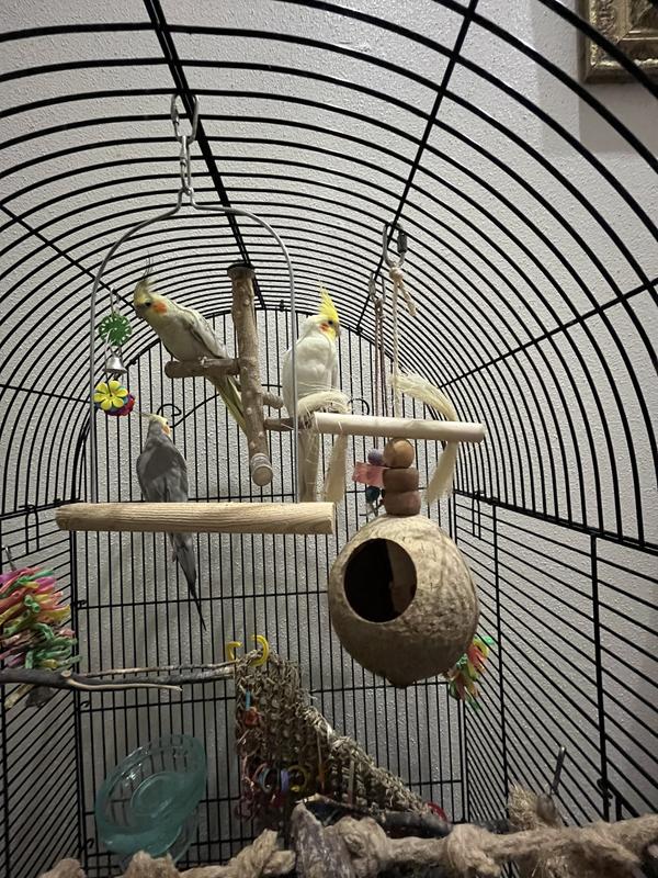This is a very good toy! My 3 cockatiels love chewing on the wooden blocks and swinging on top of the coconut part. I only worry about them possibly trying to use the open part of the coconut for breeding behavior, but it may not be big enough for that!