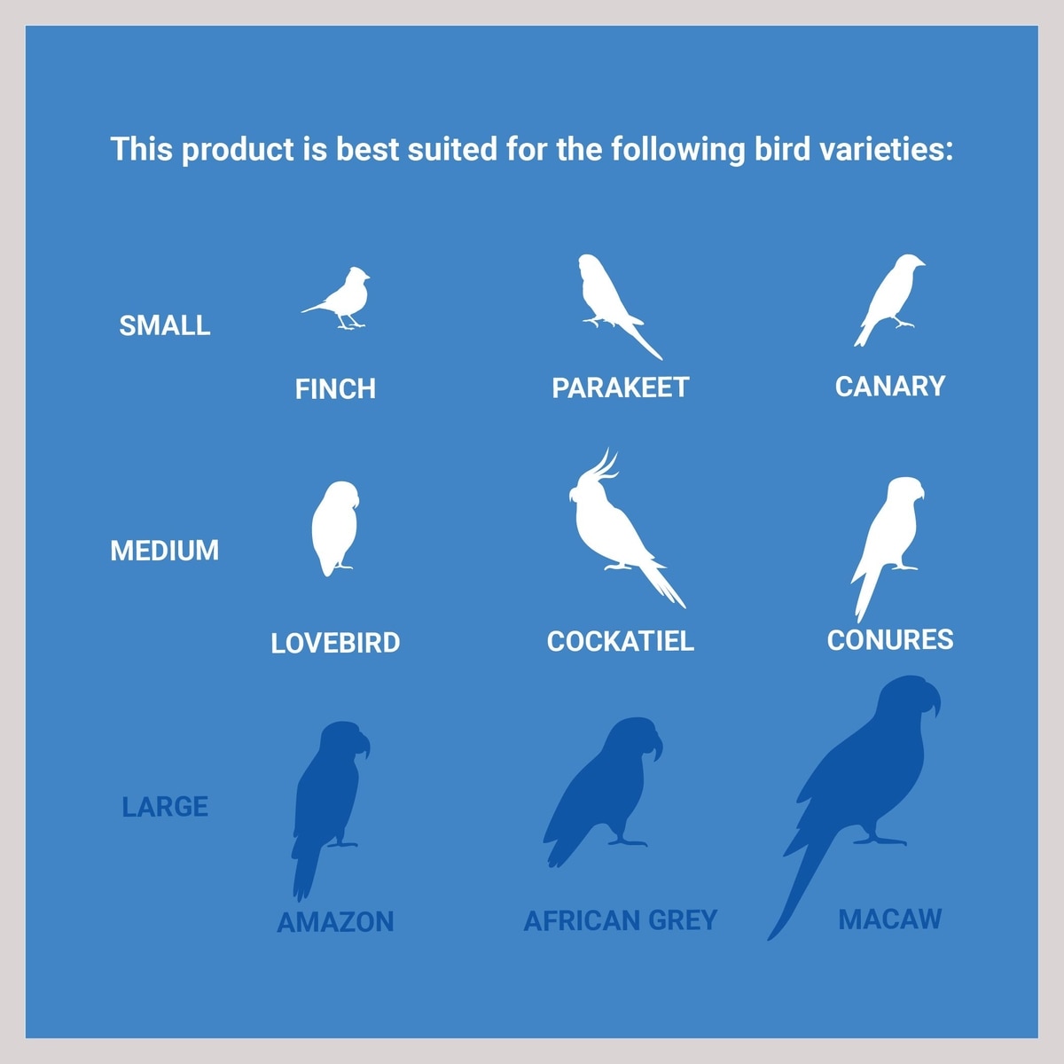 This playground is suitable for small to medium-sized birds, such as parakeets, finches, canaries, lovebirds, cockatiels, and conures.