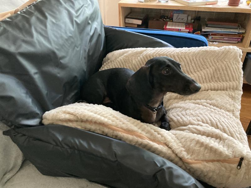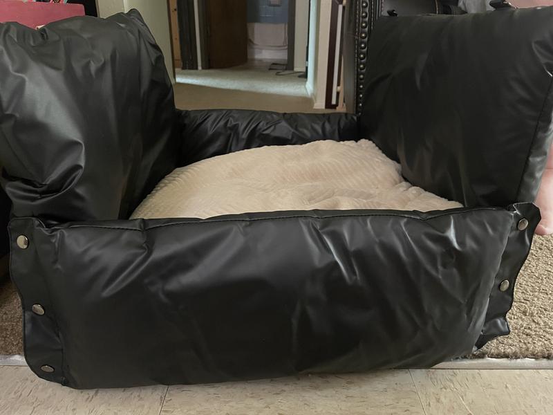 I was excited to receive this bed and I saw it had good ratings from people who received it free. But from someone who paid full-price, it did not live up to it's potential or what I'd hoped. I planned to use it in the car for our 55 lb dog, with the ability to transfer it to a hotel/overnight lodging. Pros--fit well in the seat, wipeable, seems comfy, easy to carry/transport (tho bulky). Snaps make nice little bolster sides. Cons---it's very slippery and slides off the seat unless belted in, which might work (watch the video). However, for her safety, I use a seat belt attachment that hooks to her harness so the buckle insert is already being used. The tether that's included (sewn to the cushion) is a joke. It's thin, the latch is sized for a cat and I'm not even sure what it's intended for other than to make it difficult for the dog to turn around and reposition. It certainly isn't to be depended on an accident. The latch was too small to fit on my dog's collar ring anyway. So you have to have a safe method for securing your dog and the highest crash rated ones use the selt belt through a vest. Again, you wouldn't be able to use the seat belt for roping this cushion down if it's being used for securing your dog safely. The back flap flops down on my dog. It would have been so easy to include a strap that would go around the seat back and clip onto the clips that are already sewn to the lounger (for when you close it up and transport it). I saw a picture where someone removed their headrest then put it back over the lounger handle, but I couldn't get my headrest out. So the back pillow did not stay up. Yes, the cushion part is removable because it can't be attached, even temporarily while in use. Some Velcro would do wonders and if I were going to use this, I'd probably put some on. I carried it out to the car, only to realize I'd dropped the pillow portion on the ground (it was folded up, but not strapped up). Once the dog was on it in the car, it still slipped when she moved, unless the sides of the lounger are up and snapped. But then it's a little tight for her. I was hoping to keep at least two flaps down. Our dog is 55 lbs and the cushion is square and not big enough for her. I also bought the seat "extender" box to place on the floor behind the seat in front, which was a must for us or the dog and the cushion slid off the seat. It's just so slippery and slick. Include a seat strap or something to secure it to the seat back (or sides) which is not seatbelt dependent and make the cushion attachable and I'd be more enthused. But without those two things, it's not going to see use as a car travel seat cushion/bed--the reason I bought it. I'll stick with a plain dog mat and towel and probably still use the seat extender box becuase that makes sense (though when traveling, I usually put a duffle or two there or a cooler, as that is valuable packing space. But for day trips/errands, it's nice to have). I tried to get fancy with this!