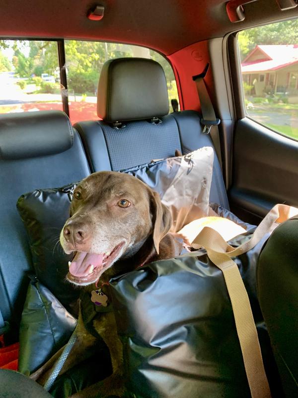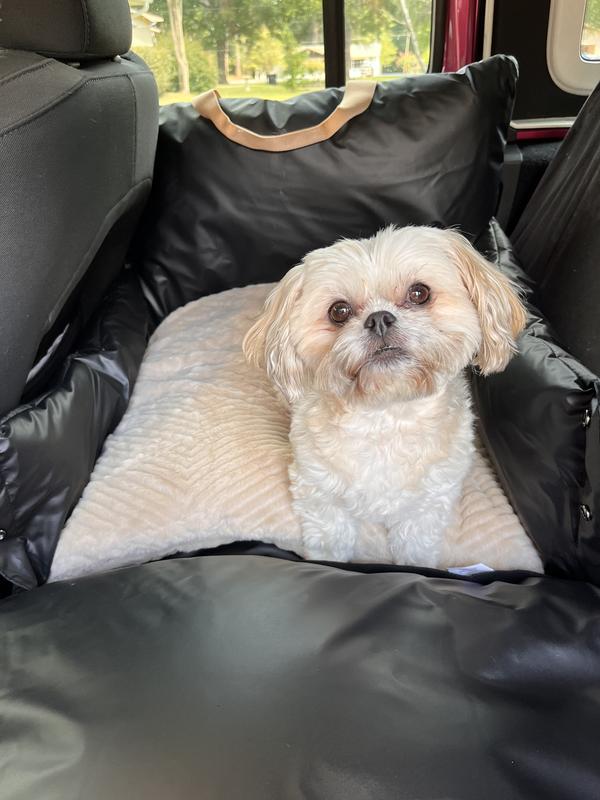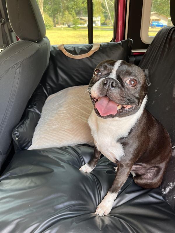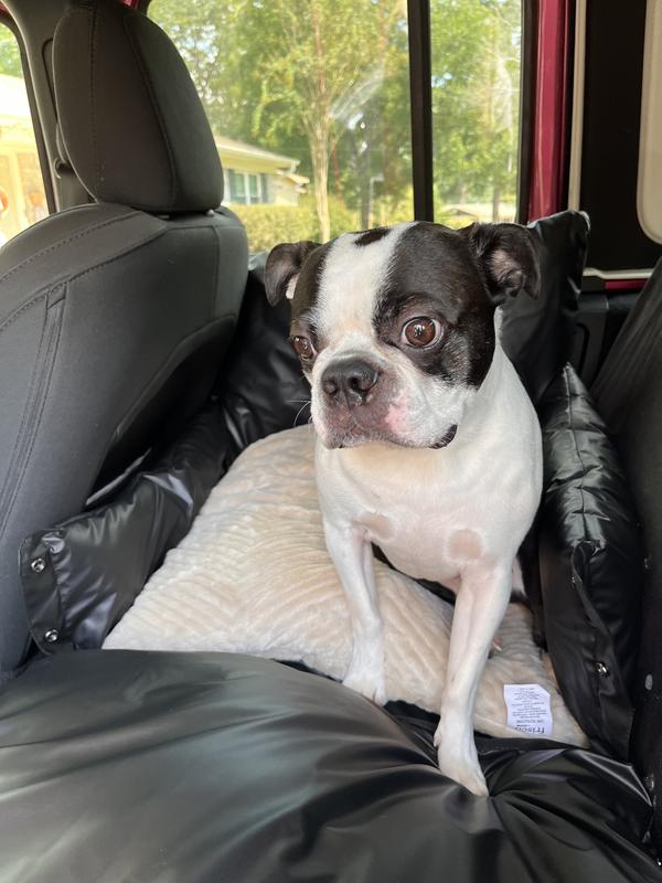 We took our dog on a 35+ hour roundtrip road trip and he was so comfortable in this bed! Plenty of space for him to curl up and snooze for hours. It was secure with the loops to put the seatbelt through as well as the hook to attach to his harness for extra safety precautions. Highly recommend!