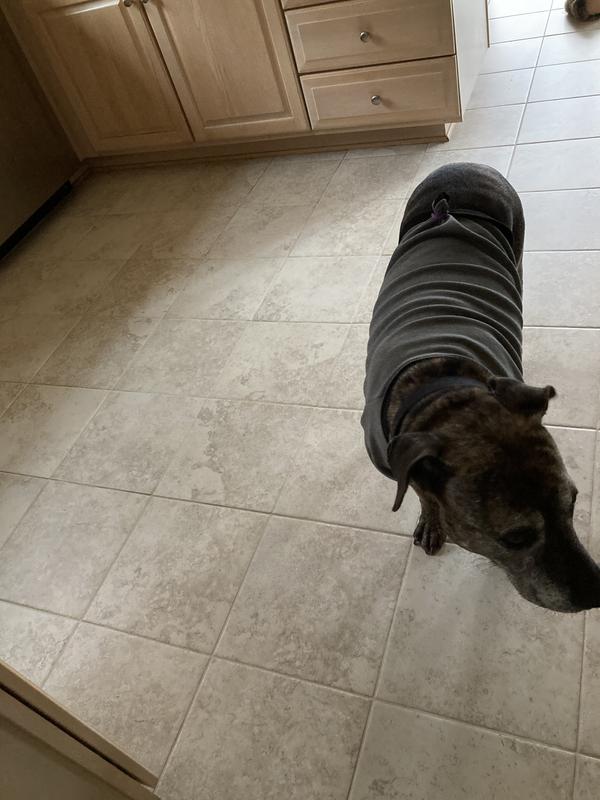 Fits perfectly. Lexie is a dog that has hardly any tummy fur so I sewed a piece of black sweatshirt material on the underside to keep her tummy warm. When I took