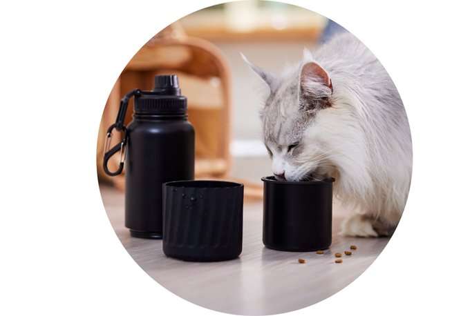 - This backpack provides enough storage space for both you and your pet, a feeding station that includes a fold-out mat, a food storage container with two compartments for keeping treats and food separate, and a set of two collapsible silicone pet bowls.