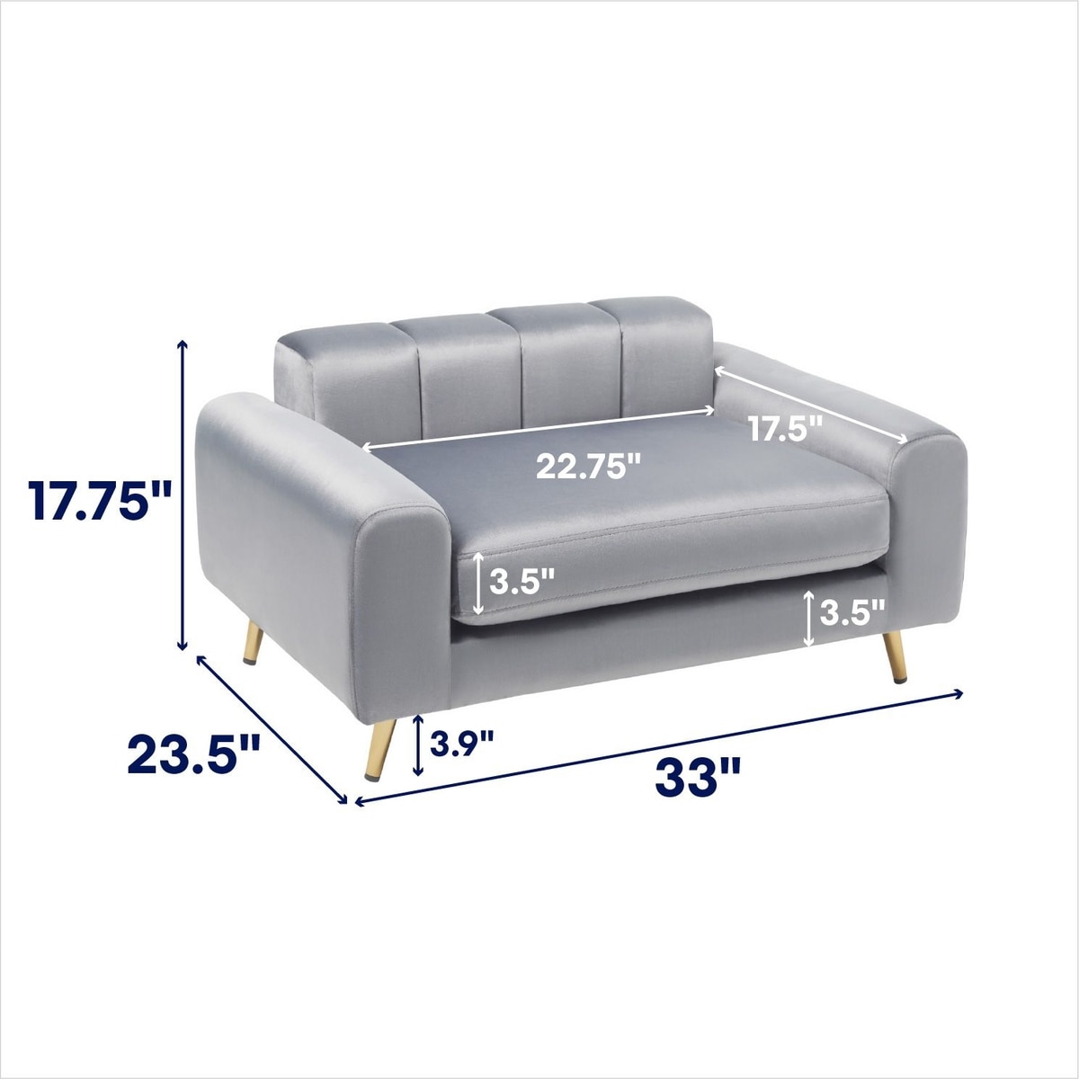 - Features a velvety soft surface, padded rolled arms, soft back support and golden metal legs.