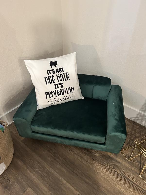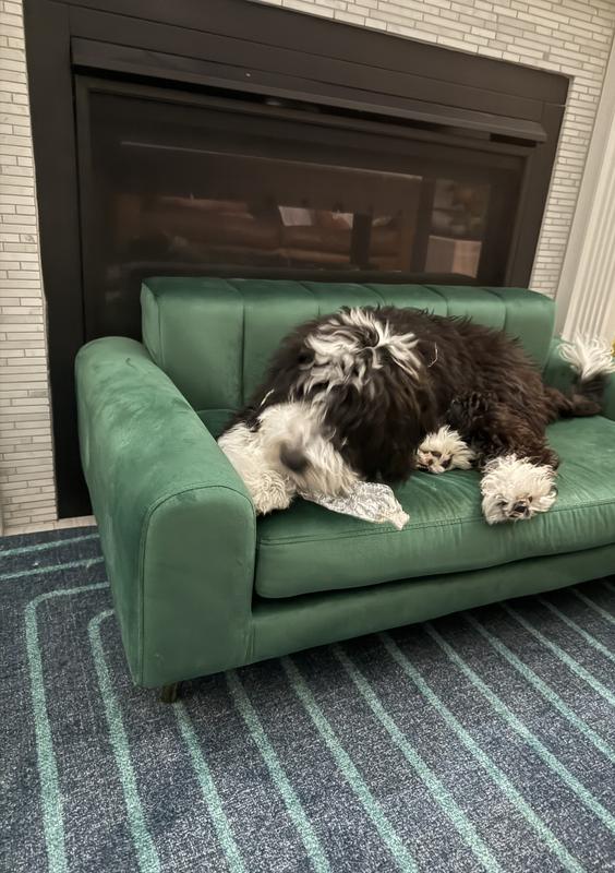 I bought this sofa for my new house, to match the green velvet sofa I bought for the living room. This sofa was much bigger than I expected, which is a good thing. I think all 3 of my girls could squeeze on it, if they wanted. The feet do elevate it off the ground and my smallest Bijou finds it intimidating to jump on, so she had been avoiding it. Okami and Truffles have no issues jumping up on it. I will say, they much prefer my sofa to theirs, but it’s nice to have such a beautiful option for them