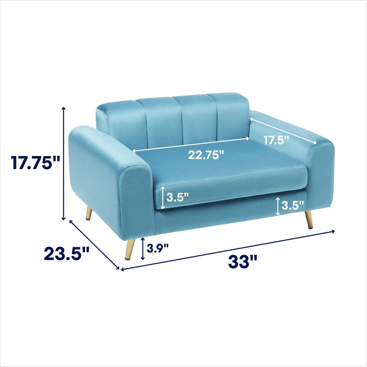 - Features a velvety soft surface, padded rolled arms, soft back support and golden metal legs.