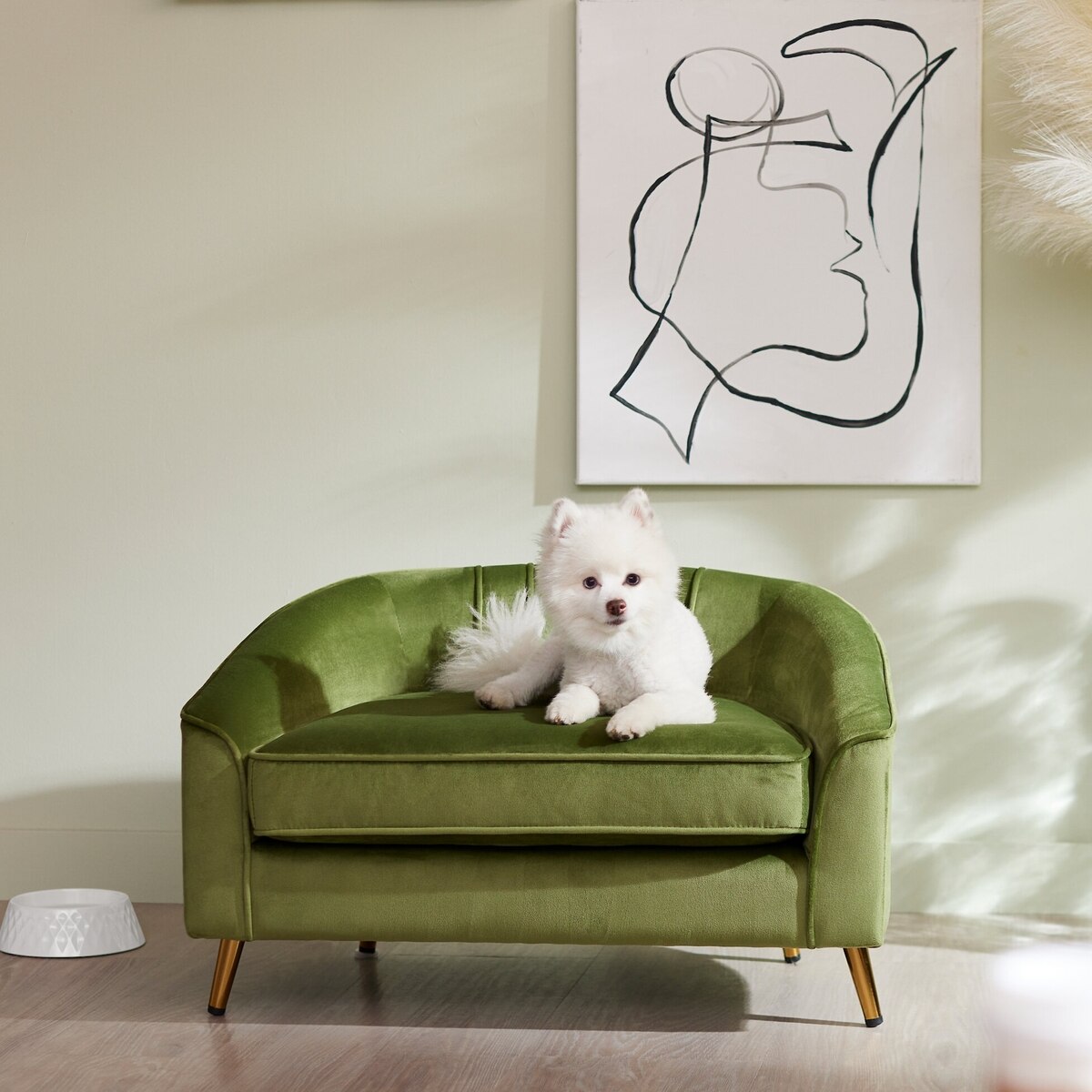 #ReceivedFreeProduct My dog finally has a sofa all of his own and hopefully he will stop stealing my spot! The Frisco elevated curved dog bed is extremely nice and looks like a real piece of furniture. It fits in very well with our house that leans mid-century modern in style. We got the Olive green color. The sofa legs are cool looking and are gold with clear acrylic at the bottom, so they do not damage floors. My dog is probably at the max size for this dog bed. He is a 42 pound springer spaniel, but he likes to curl up small in his dog beds and have the sides hold him in (he is not a sprawler), so the Frisco works well for him. The assembly is just putting on the four legs with the included allen wrench. Each leg has 3 screws. I got on three of the legs quickly on my own and had to call in my husband to help with the last one because I couldn't get two of the screws to catch. He played with it and had that leg on in a few minutes. It probably took us about ten minutes to do the assembly. Our spaniel would definitely recommend this cute dog bed. I can tell he feels special because it is elevated off the floor!