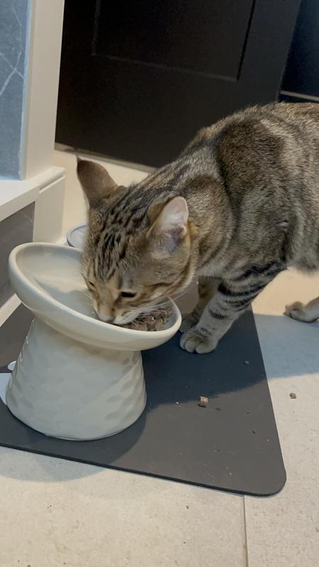 I've been on a search for the perfect cat bowl. We've tried so many and I think this might be the one. Niko is a petite cat, he weighs about 9lbs and is sort of small due to being malnourished as a kitten. He seems to struggle to get food out of bowls, both wet and dry. This is the only bowl he has been able to finish his wet food from. All of its features are important; the raised & tilted bowl, the ceramic for its weight/washability/microwave safety, and the silicone ring around the bottom making it slip resistant. I also love that it is not very deep, so he can comfortably get his little face in there to chow down! I'm very happy with this purchase and I think Niko is, too!
