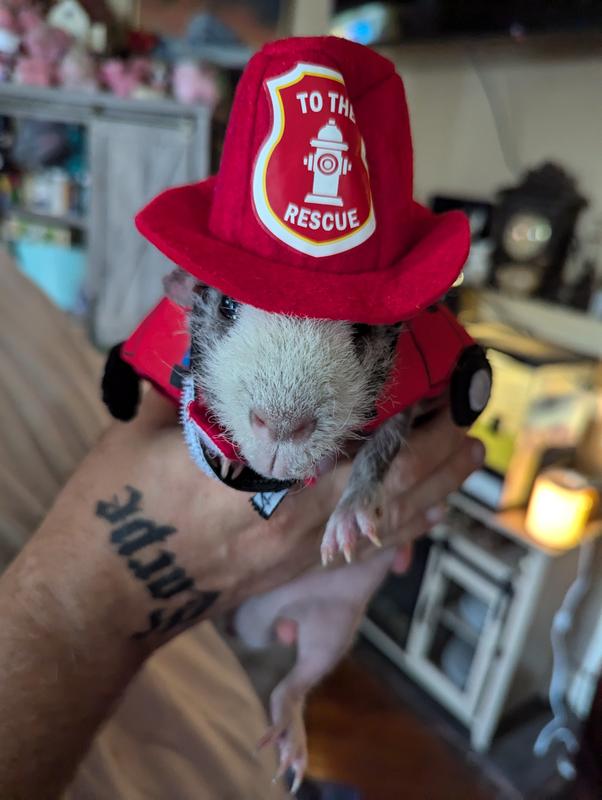 WeeWoo! Firefighters Peanut and Popcorn reporting for duty! These two little guinea pigs love being firefighters. The outfit is full of cute details like a little hose with silver nozzle and a little silver ladder on the top of the outfit. It is very sturdy and holds its shape. The belly strap does a great job of holding the firetruck to the pigs' sides, but the front straps are just a bit too wide to keep a good fit if the pig is less than thrilled about being in the outfit. Popcorn was able to use the firmness of the outfit to push her front legs out of the harness, but Peanut walked around, pretending to be a firetruck, like a champ! The hat, sides, and front all attach using velcro, which makes dressing the guinea pig much easier. It would just be better if the front enclosure (that goes around the neck and under the guinea pig's chin) were a little smaller.