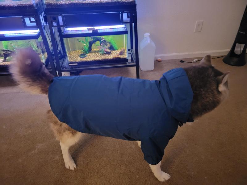 It was the only item in my order that fit as described. My dog looks so cute and is protected from the elements. It also swishes when he walks like a tracksuit which is a funny touch. My brother kept describing it as it’s constructed like actual people clothing quality.