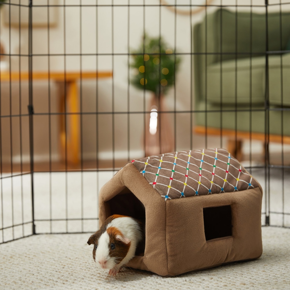 This is a spacious sleeping/hiding spot for my guinea pigs. There is plenty of space inside of the house and I've seen both of them nap in there together at one time comfortably! I ordered another one right away once I saw how soft and large this home was. The only reason I give it 4 stars is because of the shipping method. The gingerbread house arrived in a large, wide, flat box (way too much packaging for the product) which cause one corner of the house to not quite pop up into place correctly. I've tried multiple attempts to get this corner to stay upright but it appears to be stuck this way. Same exact issue with the 2nd gingerbread house I ordered. Great product for the after holiday price!