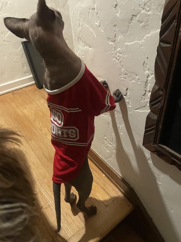 Adorable shirt, perfect fit and feels like good quality material. If you’re a sports fan, get this for your pup to wear on game day! Very cute addition to your pups collection.