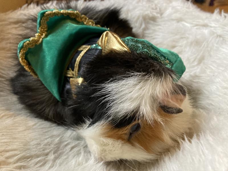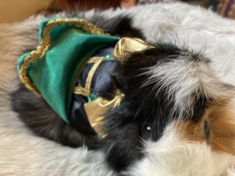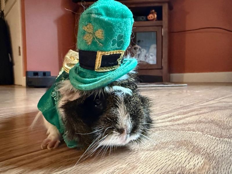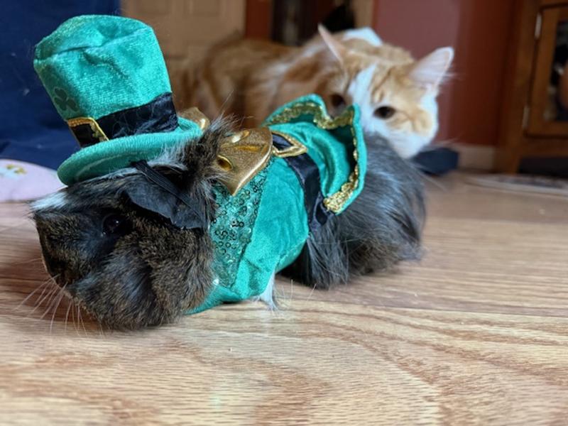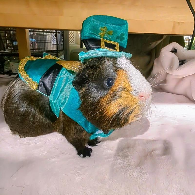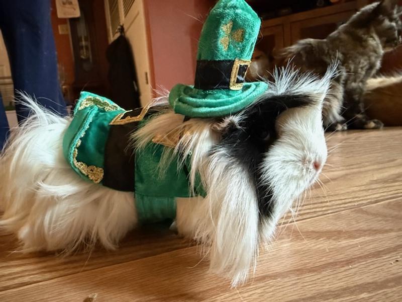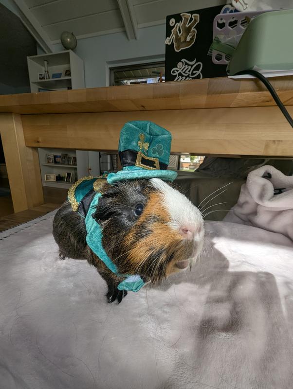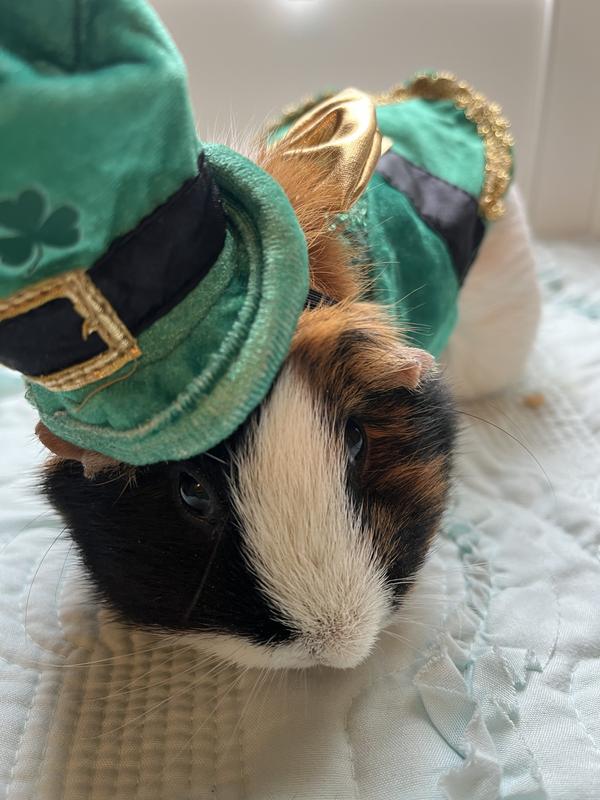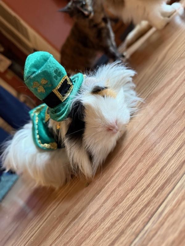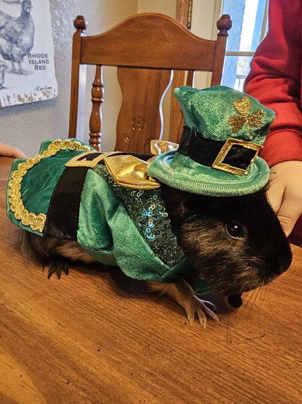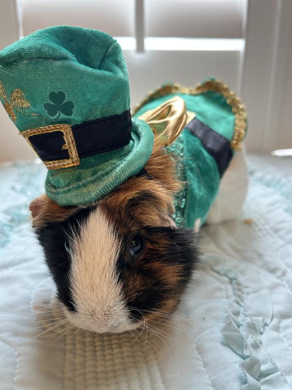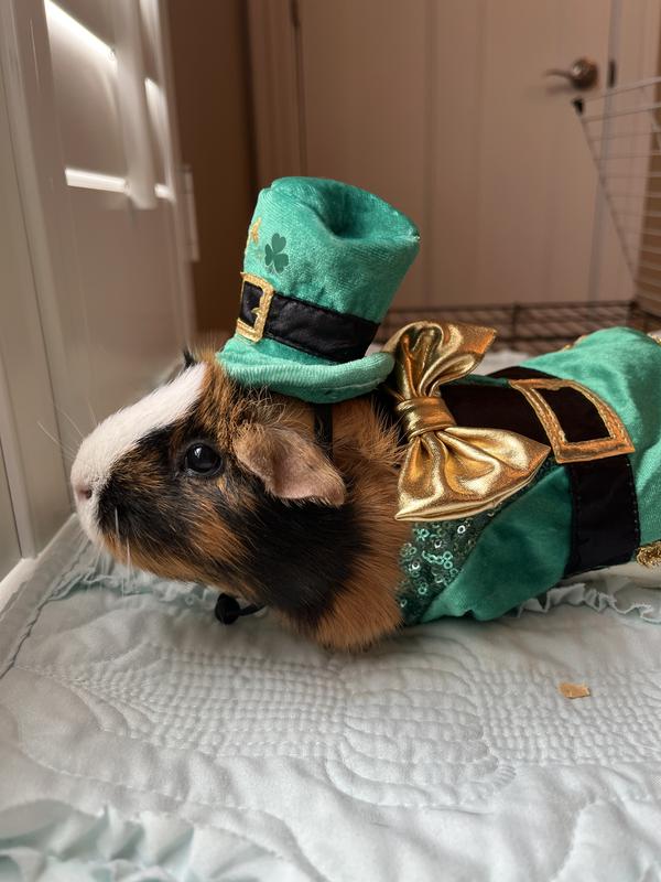 Ufortunately, our senior Guinea Pig "Koko" passed away before she got a chance to wear her St. Patty's Day outfit. That said we passed it along the a firend and