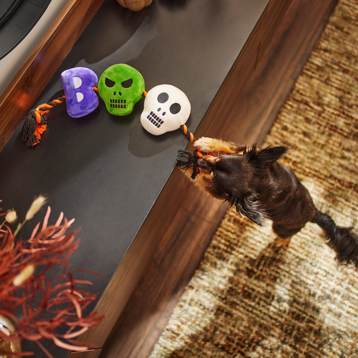 - Plush, squeaky “Boo!” toy with a poly-cotton blend rope connecting three individual plushies.