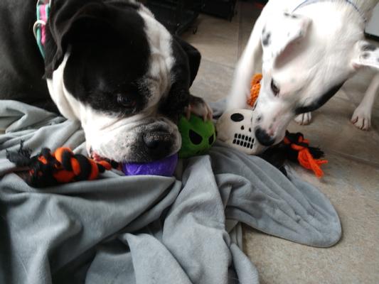 I bought this for my girl because she loves playing tug o war and she also loves squeaky toys. This one fits the bill perfectly & I love the Halloween theme. This