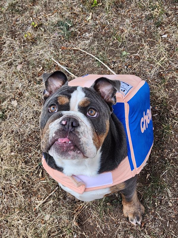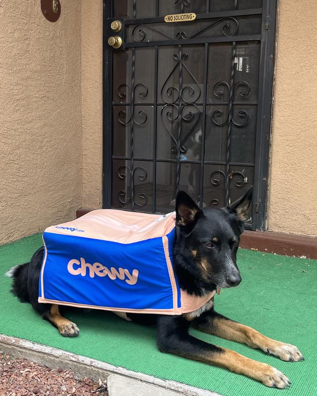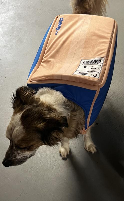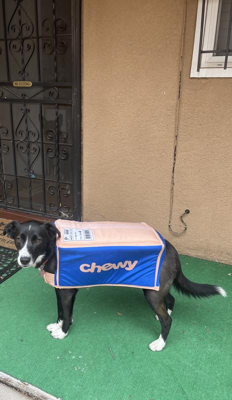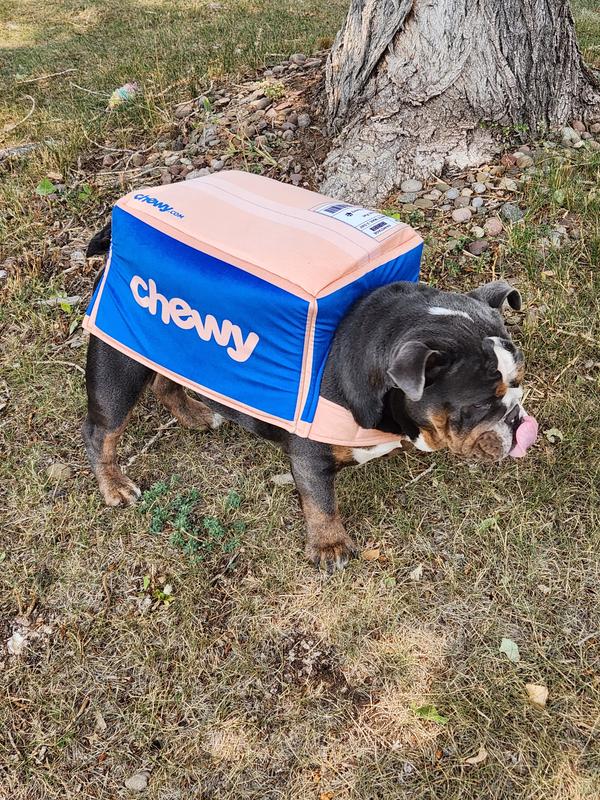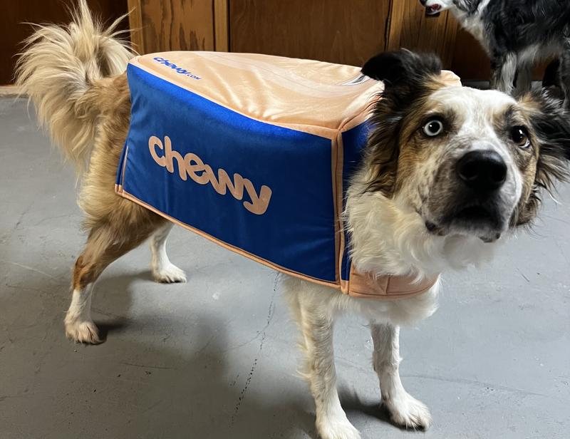 What a great costume. I really like the softness of the material. I’m getting my dog used to it in small doses to stop him from ripping it off. It is really cute and he does look like he has a chewy box on his back. Right now, two cats are using it as a soft bed. I will update this review with a photo once my boy is used to it. Thank you. This is really cute.